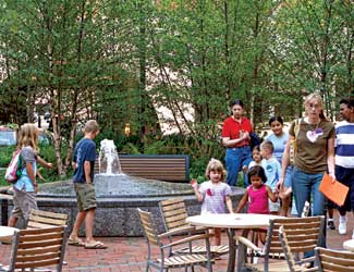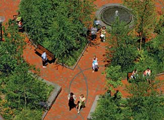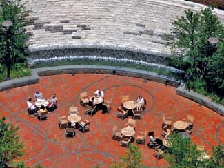 Many food vendors located in adjacent buildings service the people who fill the garden?EUR??,,????'?????<????????????EUR??,,??s tables and chairs every day, and appropriately scaled lighting supports nighttime use. Seating choices are provided by the seat walls, benches, and movable chairs for the coffee drinkers in the morning, office workers at lunch, and strollers and revelers enjoying nighttime activities. The access, open views, readily available food, and seating choices all contribute to attracting large numbers of people, which increases safety.