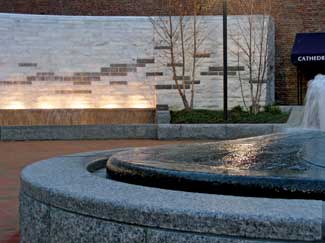 The Origin Fountain at the center of the garden is located off the diagonal axis of the main fountain. The east side of the garden faces a large service ramp which required the additional screening provided by a deeper plant bed. The off-axis condition means that the entry progression is less predictable. The main fountain?EUR??,,????'?????<????????s water wall draws people into the central plaza. At over 50 ft. long and 15 ft. tall, the water wall creates a refreshing microclimate during Louisville?EUR??,,????'?????<????????????EUR??,,??s sweltering summers. Waterfalls from the upper weir to the mid-basin and again to the lower pool where people sit on the seat wall and touch it. Horizontal courses of split-faced stone recall nearby indigenous waterfalls, and the stone?EUR??,,????'?????<????????????EUR??,,??s rough texture animates the falling water. A dark stone ?EUR??,,????'?????<????????seam?EUR??,,????'?????<???????? in the white wall adds to the geological reference and adds seasonal interest.