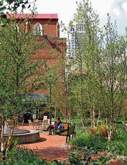 Because the site is in an emerging downtown area, safety is a large concern. Rather than fencing and closing the site at night, which we thought would conflict with the CIR?EUR??,,????'?????<????????????EUR??,,??s mission, site design tenets from William H. Wyte?EUR??,,????'?????<????????????EUR??,,??s work were applied to the design. Multiple access points into and across the site are critical to people feeling safe in the space. The grading and planting provide unimpeded views from the edges through to the large central open space, while at the same time creating a comfortable prospect from within the garden to watch the passing sidewalk traffic.