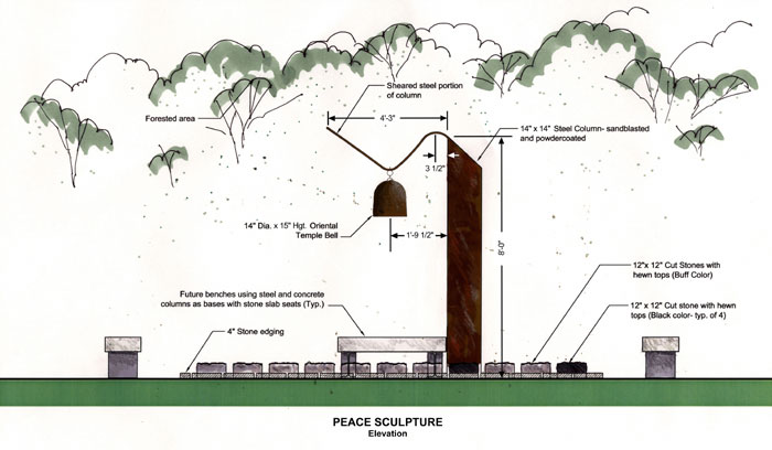 A piece of twisted steel brought from the wreckage of the WTC in New York City on May 2002 has been sculpted by architect Scott Hurst and landscape architect Matthew Gart, ASLA, of the Virginia Tech Office of the University Architect. The Montgomery, Va. County Board of Supervisors has accepted the peace sculpture as a donation for outside display at the Government Center in Christiansburg, Va. ?EUR??,,????'??The sculpture was originally intended for the Virginia Tech campus, but when it was decided to install it off campus in Christiansburg, the Rotary Club decided to mostly keep the original design,?EUR??,,????'?? Mattew Gart explained to LASN. ?EUR??,,????'??A few details are being left out as I understand, those being the stone edging we wanted to layout in a Fibonacci sequence and the benches. As we are no longer involved with the project, I am not sure which other elements of the original design will be deleted.?EUR??,,????'?? The county engineer will be responsible for the concrete footing, and New River Engraving will make a plaque that reads: ?EUR??,,????'??This sculpture is made of steel from the World Trade Center in New York after the attack of Sept. 11, 2001. It was erected by the Rotary Club of Montgomery County and the government of Montgomery County as a symbol of the need for world peace and understanding, and in remembrance of the many of all nations who have sacrificed their lives for that cause.?EUR??,,????'??