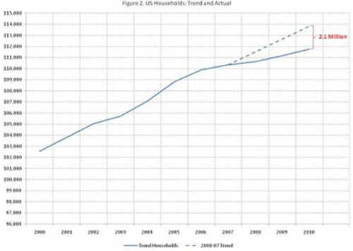 NAHB research estimated 2.1 million missing but expected households have been delayed due to the Great Recession. As the economy and the job market improves in 2012, these potential households, now doubled-up and living with family members, will be unlocked. This will lead to increased demand for rental housing and eventually emerging as prospective homebuyers. - Courtesy of NAHB