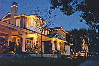 As the sky faded from blue to gray Jeff Tolly hit the switch, and the lamps sprung to life. At first the tones were muted, but as the sky darkened the effect became more and more pronounced. Soon the front of the home was painted with a pleasing mix of layers and textures. Uplit trees (with leafless winter foliage) stood out and other lamps brought out columns and other architectural details on the redesigned home?EUR??,,????'???s front. Tolly and Wareham scurried to place and adjust lamp fixtures, always keeping the beams pointed away from the viewer.