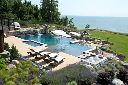 This award-winning poolscape features PermaStrip and CleanLine edgings throughout. The narrow, low-profile CleanLine aluminum landscape edging flexes to allow for making curves that create a natural look in the landscape, which is pleasing to the eye. The framing of the pool with PermaStrip is noticeable inside of the curved planting area edged with CleanLine. The properties of the aluminum alloy used for edgings allow it to easily flex to form natural curves with no effort during the installation. Straight lines created by the strip parallel the lines of the pool and patio. The rigid "L" shape of the product allowed for pin straight lines to be easily formed. Permaloc's PermaStrip maintenance strip edging has a modern look of straight lines, creating a nice look around the pool area.