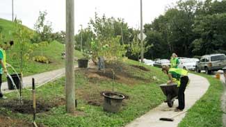 As planning for the Philadelphia University day of service drew closer, many other volunteers came forward to lend their support. Funding for this project came from Philadelphia Councilman Curtis Jones, Jr., the Schuylkill Project (William Penn Foundation grant), and an East Falls Community Council community grant. SEPTA approved the student designs, removed fencing along Midvale Avenue, fixed broken fencing and removed dead trees and vines. SEPTA personnel, under the leadership of Skip Brooke, were also there all day supporting the students and making sure they were safe. Ken Kolodziej, an East Falls resident, worked hard to make sure all of the trees were delivered to the site, brought in workers and contributed supplies. Ogontz Avenue Revitalization Corp. donated 18 trees. PWD contributed rain barrels for the Station buildings. PHS supplied all required tools. Tom Bateman, East Falls resident, has volunteered to water the trees for the next two years. (Editor?EUR??,,????'?????<???????????????????????????EUR?????????(R)???????+?EUR??,,????'?????<???????s note: Designating responsibility for watering the trees is important! Just ask the Texas Trees Foundation and Texas DOT?EUR??,,????'?????<???????????????????????????EUR??????see "Water the Trees? Oops, We Thought You Did".)