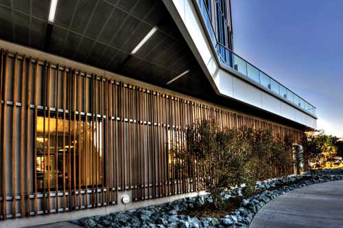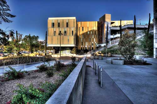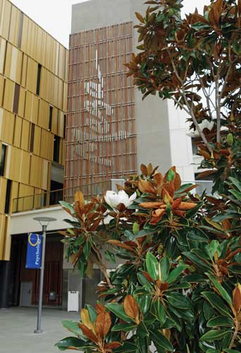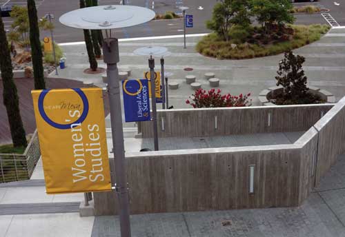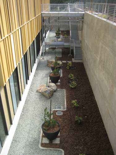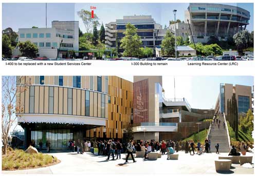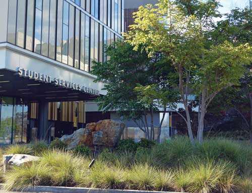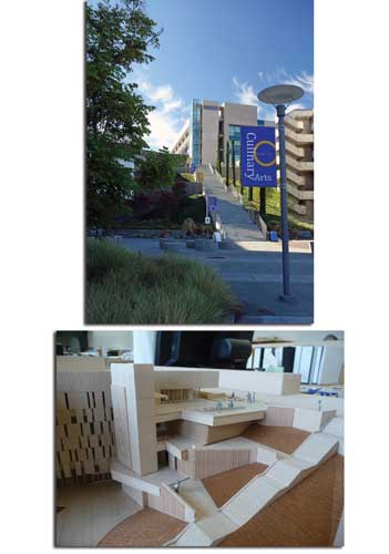 Mesa College is part of the San Diego Community College District (SDCCD), which is now more than a decade into a major capital improvement program for the four-campuses in Southern California. The program, funded by several voter-approved bonds totaling more than $1.5 billion, includes nearly 100 new instructional and career training facilities, student and public safety enhancement projects, parking facilities and campus-wide infrastructure projects. Quick hand sketches were useful in helping lay out the spaces and site functions, such as the grassy slope, the grand stairway, the positioning of the lighting, the cypress trees leading down the hill and onto the plaza, seating pods, drainage and the stage area. "We have opened a number of extraordinary new buildings with state of the art instructional equipment," said SDCCD Chancellor Constance Carroll. "As a result, our students are extremely well educated and well prepared to either transfer to a four year university or enter the workforce." One of these projects is a bold and innovative design by San Diego-based MLA Design Studio-Landscape Architects and ARCHITECTS hanna gabriel wells (HGW) for a new Student Services Center, which won an "Orchid Design Award' from the San Diego Architectural Foundation, and an "Award of Merit' from the American Society of Landscape Architects. The narrow and steep landscape slope between the new Mesa College Student Services Center (left) and the retained I-300 Building (center) had uninviting switchback stairs connecting the lower parking area to the upper campus. In the words of the ASLA jury, the 85,000-square-foot building and site works set on a steep slope at the edge of Mesa College "is elegant and works well with the (surrounding) architecture." The new Student Services Center is also environmentally friendly, achieving LEED Gold certification. Water efficiency was achieved by stormwater collection and use of drought-tolerant plants and low-volume irrigation. Clean power for the project was drawn from the campus photovoltaic system. Quick hand sketches were useful in helping lay out the spaces and site functions, such as the grassy slope, the grand stairway, the positioning of the lighting, the cypress trees leading down the hill and onto the plaza, seating pods, drainage and the stage area. Grade Changes and Tight Budgets As with all projects, there were challenges. To address a 50-foot grade difference on the narrow site, MLA and HGW used the building's retaining walls and terraces to stabilize the slope and to create a series of spaces for students to gather, including an upper-level cafe and amphitheater, and a lower-level performance area. Another challenge was a campus maintenance staff stretched thin by a tight budget. Maintenance strongly pushed for incorporating more hardscapes over softscapes to ease maintenance requirements. Also, the staff wanted any installed softscapes to have minimal plantings to ease maintenance requirements. Fescue grass mounds with sculptural Chinese Flame trees direct pedestrian flow through the lower plaza. The landscape architects pressed for a balance on the hardscape/softscape issue, pointing out that large expanses of hardscape would of course capture too much heat and create a distracting glare for students viewing the space from the levels above. For a solution, MLA developed a graphic banding pattern in the hardscape to complement a planting scheme that breaks up the lower plaza and allows the steep slope to spill onto the lower plaza.