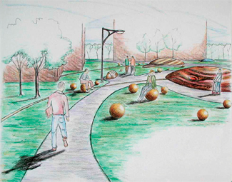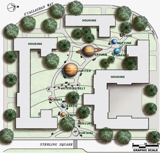 The final plans include two bituminous concrete walkways, imbedded with colored glass beads, that follow curvilinear paths between nine dome shaped concrete structures. These structures or ?EUR??,,????'??sculptures?EUR??,,????'?? will represent all the planets of our solar system. At the beginning of the walkway to the park, there will be a large interactive sundial, followed by two walkways toward the planet sculptures. One of these two paths will make a more direct route through the site while the other will meander among the planets. Along the pathway will be seating, and informational plaques that provide facts and scientific theories about the planets and other elements of our solar system.