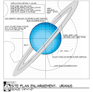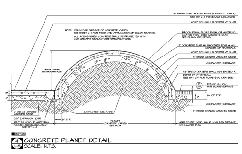 The planets will be represented by dome shaped concrete ?EUR??,,????'??sculptures?EUR??,,????'?? that will be rendered to simulate the actual colors and surface textures of the planets. The renderings will be based on actual photographic images made available from NASA and other scientific sources such as the Jet Propulsion Laboratories. These images have been incorporated into the construction documents, to ensure the representational intent. The plans and specifications have directed the contractor to chemically color the planets using a specialized colored acid staining system. This process will not only ensure a detailed image of each planet, but provide longevity of colors as opposed to a ?EUR??,,????'??wearing?EUR??,,????'?? color seal-coat process. An anti-graffiti coating will be used to protect the surfaces.