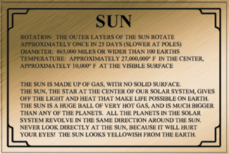 Educational plaques will be placed throughout the park, providing factual information for every planet, the Sun, and Asteroid belt. The plaques will provide information such as each planets?EUR??,,????'??? size, it?EUR??,,????'???s distance from the sun, the number of moons, length of year, temperature and special characteristics pertaining to it?EUR??,,????'???s own unique qualities. The plaques will be mounted on large weathered stones, similar to the stones used representing the asteroids. These plaques will provide an educative element to the project, allowing the park visitors to gain knowledge and understanding of our solar system.