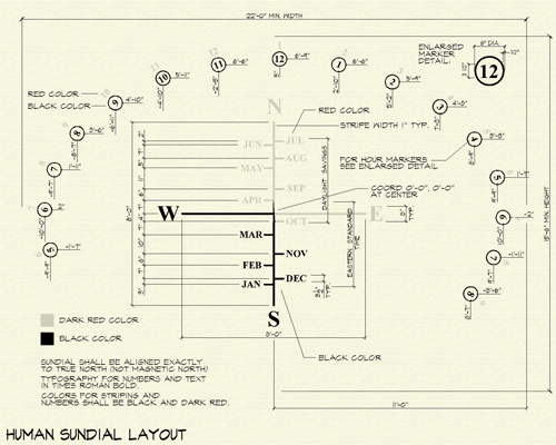 Another experiential element in the design is the proposed interactive sundial, located at the park entry. Like other black-top hop-scotch-like games, the interactive sundial is scientifically designed to allow someone to physically stand on and read the correct time by observing where his or her shadow will fall. The sundial design, will be constructed according to longitudinal and latitudinal coordinates, providing a very accurate layout. The sundial will be constructed with two colors allowing adjustment for Standard and Daylight Savings Times.