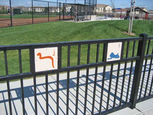 Surrounding the area, 24-unilateral signs posted on fence inlays display the hieroglyphic alphabet. Researched carefully by the CCSD and Stantec design teams, with input from graphic artist Melinda Lang, the alphabet is accompanied by a translation key posted for children and parents in the play area, creating an educational and interactive element. The fencing also provides a secure supervised play area used by the adjacent preschool.