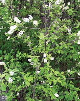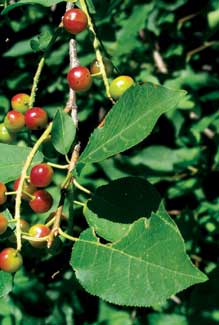 Habitat/Plant Community and Geographic Range: Chokecherry is found and extensively used in shelterbelts, windbreaks, thickets and borders. It occurs especially along streams, open wooded slopes, clearings, open fields and roadsides. Normal Water Level: Chokecherry prefers upland moist to dry soils. Sensitivities or Other Tolerances: Exposure: Full sun to part shade. Salt: Medium. Nutrients: Moderate to somewhat tolerant to nutrient increase. Siltation: Medium. Insects: Medium, occasionally borers, commonly tent caterpillars and aphids. Other: Chokecherries have many disease problems with black knot being a local severe problem. Also susceptible to stern decay, shothole, Valsa canker and honey fungus. Reduce disease problems by avoiding injuries caused by mowers, weed whips and other equipment. Although fire will top-kill this species, it resprouts vigorously. This species is moderately tolerant to general pollution and stresses. It is moderately sensitive to SO2 and Hfl; sensitive to Hcl, Cl and soil compaction; and resistant to drought/heat and mine spoils. Design Considerations: Chokecherry is well suited for windbreaks, screens, noise barriers, patio and Japanese gardens, wildlife habitat and mass plantings for soil stabilization or erosion control. It does well in stream edges, providing thermal cover over water and stabilizing banks. It has been used in mine land reclamation, roadways and construction sites because of its fast, rhizomatous spread. This species is also used as an ornamental tree due to its white, fragrant flowers, red fall color, and edible fruit. Concerns: Chokecherry tends to be short lived in our area. Protect by planting in protected sites or on the east side in full sun, which will reduce the risk from late spring frosts. Tent caterpillars can be a nuisance because of their silvery webs on the branches. Although chokecherry spreads by runners and grows rapidly, which can be a concern, it is usually preferred in erosion-control situations. The four major limiting factors are its intolerance to shade, poor drainage, frequent flooding and heavy clay soils. Wildlife Use: Chokecherry provides food, cover and habitat for many birds, including, ruffed and sharp-tailed grouse, ring-necked pheasant, bobwhite quail, wild turkey, eastern bluebird, catbird, crow, common flicker, crested flycatcher, common grackle, evening and rose-breasted grosbeak, blue jay, indbird, Baltimore oriole, American robin, yellow-bellied sapsucker, white-throated sparrow, starling, scarlet tanager, brown thrasher, hermit and wood thrush, veery, towhee, red-eyed vireo, cedar waxwing, and hairy, red-bellied and red-headed woodpecker. It is also used by skunk; red and gray fox; squirrel; snowshoe and varying hare; cottontail rabbit; raccoon; eastern chipmunk; deer, meadow and white-footed mouse; and extensively by white-tailed deer. Black bear love the fruit. The early-spring flowers are important nectar sources for butterflies, bees and ants. Nursery/Plant Information: Available: Widely (many cultivars available). Types: Balled and burlapped, potted and bareroot stock and seed.