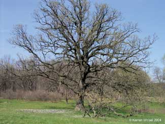Habitat/Plant Community and Geographic Range: Bur oak is the primary tree species of oak savannas, although it is also found on dry uplands on limestone and gravelly ridges, sandy plains, open fields, loamy slopes and moist floodplains, often in nearly pure stands. Normal Water Level: Bur oak can tolerate a wide range of soil moisture from wet to dry. Sensitivities or Other Tolerances: Exposure: Full to part sun. Salt: Medium. Nutrients: Moderately tolerant to nutrient increases. Siltation: Medium. Insects: Few insects seriously damage this species, oak lacebug may heavily defoliate. Other: Bur oak is tolerant of city smoke and other air pollutants. It will tolerate compacted soils but not soils being compacted on its roots. Its thick bark is fire resistant and larger, older trees often survive fire. Disease may be frequent, but is usually not serious, although oak wilt can enter a population by root graft from neighboring red oaks and kill a grove. Prune during the dormant season to minimize the risk of oak wilt infection. It has a high tolerance to oil/grease, metals, O2 , drought/heat, poor drainage, alkaline sites and mine soils. It has a moderate tolerance to HFI, general pollution and stresses. Design Considerations: Bur oak wood is used for cabinetry and flooring. It is most suited for majestic, large landscapes of savanna restorations, shade and ornamental features, golf courses, parks and shelterbelts. It also can be used in degraded sites, mined lands and other, previously disturbed sites. It is a climax tree species in drier forested areas and an early serial species of prairies. If planting this species for shade or ornamentation, give it plenty of room. Concerns: Bur oak does not have brilliant fall color and it is difficult to transplant, but its coarse-textured and furrowed bark provides year-round interest in the landscape. Bur oak grows very slowly. Wildlife Use: Bur oak leaves and acorns are eaten by deer. It is also browsed by rabbits, porcupine and beaver. Its acorns are choice food for many animals, including ring-necked pheasant, wild turkey, mallard, wood duck, clapper rail, bobwhite quail, crow, common flicker, common grackle, rose-breasted grosbeak, blue jay, white-breasted nuthatch, yellow-bellied sapsucker, starling, brown thrasher, tufted titmouse, red-eyed towhee, and downy, red-bellied and red-headed woodpecker as well as opossum, black bear, raccoon, squirrels, red fox, eastern chipmunk and meadow and white-footed mouse. Moths and many other insects use it. Nursery/Plant Information: Available: Widely. Types: Balled-and-burlapped, potted and bareroot stock and seed.