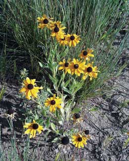 Habitat/Plant Community and Geographic Range: Blackeyed Susan has naturalized in most states east of Kansas. It is found in dry to moist open places, such as prairies, fields, savannas and deciduous woods. Originally a native prairie plant, blackeyed susan is now found in just about any habitat, including along roads and in disturbed fields. Normal Water Level: Blackeyed susan prefers upland mesic to dry soils. Sensitivities or Other Tolerances: Exposure: Full to partial sun. Salt: Medium. Nutrients: Moderate to somewhat tolerant to nutrient increases. Siltation: Low. Insects: No major insect pest. Other: This species is susceptible to powdery mildew, which is not serious, but makes the plant look very unhealthy. It is moderately tolerant to general pollution and stresses. It is moderately tolerant to drought/heat and fire. After a fire, it will sprout vigorously from the roots or the seed bank. Design Considerations: Blackeyed susan is a critical component for fast establishment of erosion-control areas and soil stabilization projects. It should be a component of most prairie, savanna and wet meadow restorations or rehabilitation sites, road cuts, hillsides and other disturbed naturalized areas. This species establishes readily from seed and self-sows, though it is a short-lived biennial (sometimes it is perennial, living more than two years). Because this species has been used for landscaping and in wildflower gardens, many designers are using longer-lived cultivars instead of the biennial native. Perennial gardens, rain gardens, cottage gardens, butterfly gardens as well as dry and moist wildflower gardens are appropriate gardens for this species. Concerns: Blackeyed susan is a low-maintenance plant that establishes easily from seed, crowding out weeds with minimal help. Therefore, if the site is optimal, you may find yourself weeding out more blackeyed susans than weeds. Wildlife Use: Blackeyed susan provides food and protection to many gamebird and songbird species, including goldfinch and house finch. This species is a host plant for the silvery checkerspot caterpillar, which camouflages itself with bits of the flower secured by silk, which feeding on the brown flower centers. This species provides nectar and is pollinated by bees, wasps, butterflies and other insects. White-tailed deer and other large mammals utilize this species for forage. Nursery/Plant Information: Available: Widely (though many cultivars are available). Types: Potted and bareroot stock and seed.