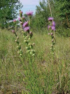 Habitat/Plant Community and Geographic Range: Rough blazing star is found in mesic to dry, sunny, sandy soils of prairies (especially tallgrass prairies), savannas, open woodlands, glades, meadows and along roadsides and railroad tracks. It is the most common liatris of dry, sandy prairies. Normal Water Level: Rough blazing star prefers dry to mesic upland soils. Sensitivities or Other Tolerances: Exposure: Full sun to part sun. Salt: Medium. Nutrients: Moderately to somewhat tolerant to nutrient increases. Siltation: Low. Insects: No serious insect problems. Other: This liatris has no serious disease problems. It is moderately tolerant to general pollution and stresses. Design Considerations: Rough blazing star?EUR(TM)s showy flowers attract songbirds, hummingbirds and butterflies, and make good cutflowers. This species is easily grown in average to dry to mesic, well-drained soils like a sandy based or well-draining rain garden because it will tolerate poor soils and summer heat. It is also ideal for perennial borders, cutting gardens, native plant gardens, naturalized areas and restorations of prairies and savannas. Mix rough blazingstar with other sun-loving perennials; it will accent the background due to its good vertical habit. Or, combine it with grasses and other native plants to create a naturalized garden. This plant, like all liatris, is an excellent butterfly plant. Concerns: Rough blazing star may need staking if it is not supported by other tall, upright plants. Wildlife Use: Rough blazing star is a wonderful nectar source for several kinds of butterflies, especially fall-migrating Monarch butterflies. Many songbirds will stop in winter to feed on the seeds. Deer and cattle relish this plant. Nursery/Plant Information: Available: Widely (watch out for many cultivars). Types: Potted and bareroot stock and seed.