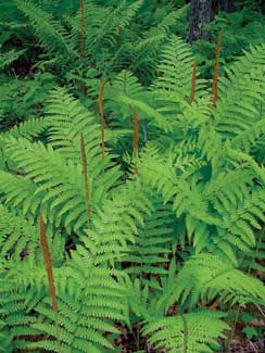 Habitat/Plant Community and Geographic Range: Interrupted fern is found in moist or seasonally wet depressions in forests, open woods, wooded slopes, ravines, hummocks in swamps and swamp edges, low prairie, moist sandstone ledges and wet roadsides. It is often found in drier places than cinnamon or royal fern. Normal Water Level: Interrupted fern prefers upland wet to mesic soils. Sensitivities or Other Tolerances: Exposure: Partial sun to full shade. Salt: Low. Nutrients: Moderate to somewhat tolerant to nutrient increases. Siltation: Medium. Insects: No serious insect problems. Other: No serious disease problems. It has a moderate tolerance to general pollution and stresses. Design Considerations: Interrupted fern is well suited for wet areas along ponds, streams, water gardens or in bogs. It grows well in shaded, wet areas of borders, woodland gardens, wild gardens, native plant gardens and rain gardens. This fern is a good soil stabilizer especially with its rapid vegetative growth. It may be one of the more interesting, textural plants for shady gardens and rain gardens. It is extremely showy in the spring and holds up well through the summer. Concerns: This species spreads rapidly, which makes it good for soil stabilization. It does prefer slightly acid to neutral soils. Wildlife Use: Interrupted fern provides food and habitat for upland gamebirds, small mammals, snowshoe and varying hare and white-tailed deer. Nursery/Plant Information: Available: Widely. Types: Potted plants.