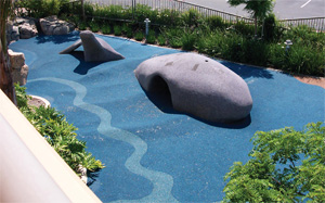 The development team wanted the older children?EUR??,,????'???s playground to center on the travels of Paul. The designers included a ?EUR??,,????'??dock,?EUR??,,????'?? three ?EUR??,,????'??ships?EUR??,,????'?? coming to port, an ?EUR??,,????'??ocean?EUR??,,????'?? with a water-spouting ?EUR??,,????'??whale,?EUR??,,????'?? and a waterfall with a stream. Kelly says wood chip and rubber safety surfacing really allowed them to be creative with the colors and patterns they used, especially when it came to developing the ?EUR??,,????'??ocean waves?EUR??,,????'?? and a map of the Mediterranean Sea.