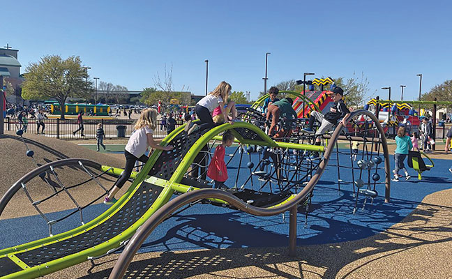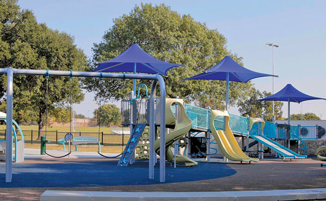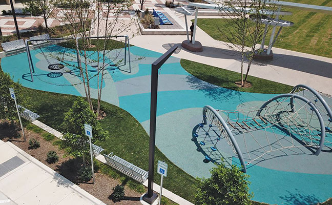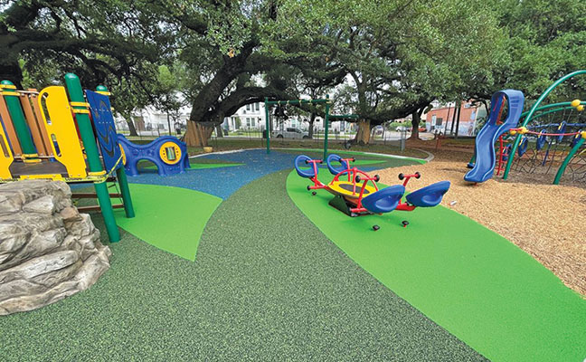 Poured-in-place rubber safety surfacing (PIP) is a popular surface for playground projects. This surface is a low-maintenance unitary system that provides consistent fall protection. Many people do not realize that PIP is porous; therefore, the foundation of the surfacing (the substrate) is just as important as the surface itself. If the substrate is not installed correctly or has improper drainage, the PIP could deteriorate, and without a proper foundation, the PIP's warranty will be affected. There are three common types of substrates: concrete, asphalt, and compacted aggregate. If budget allows, concrete is preferred as it is the most stable and durable; however, drainage can still be an issue if not properly installed. For instance, a common mistake occurs when a curb is poured around the perimeter of a concrete slab without in-slab drainage or weep holes. When it rains, this area will fill up with water. This scenario and others like it are detrimental to the longevity of the PIP. Asphalt, new or in good condition, is also an acceptable substrate for PIP. It is slightly less stable than, but can serve as a solid substrate following the same rules as concrete. Whether the substrate is concrete or asphalt, it should be installed with a cross slope of ≤2% in all directions for ADA compliance purposes. While compacted stone is a valid and less expensive substrate option, it is the most difficult to install correctly and can lead to erosion and settling issues if not built to spec. The following specifications should be followed related to the site grading, compaction, and drainage requirements for installation areas that will have an aggregate substrate: