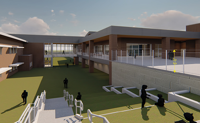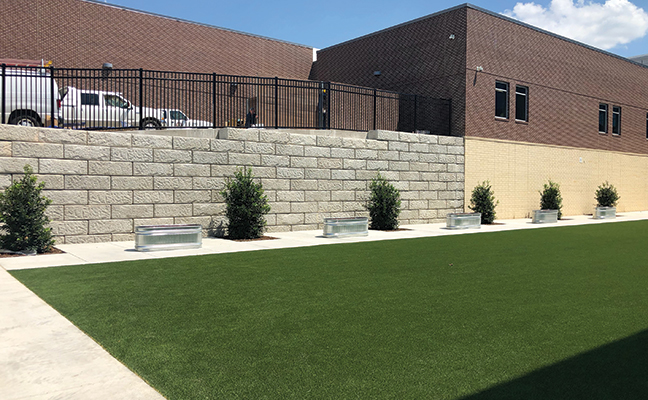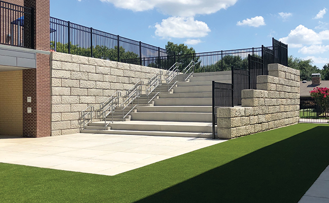 Located in Virginia Reinhardt Elementary School in Rockwell, Texas, this retaining wall project utilized precast concrete for a durable option to complete the recently renovated school. The goal of introducing the retaining walls was to create a better flow of pedestrian traffic. Superior Concrete Products engineered, manufactured, and installed five retaining walls varying in length and height from 130 feet long by 15 feet high, to 210 long feet by 16 feet high Northshore Granite Recon Retaining Wall. The retaining walls were designed as gravity walls, meaning the soil was excavated and cut on the existing site. Their Mechanically Stabilized Earth (MSE) walls are built with Recon blocks and can stand up to 45 feet high under the right soil conditions and with the use of geo-synthetic grids between layers of soils, while their Gravity walls can stand as high as 20 feet without a geogrid.