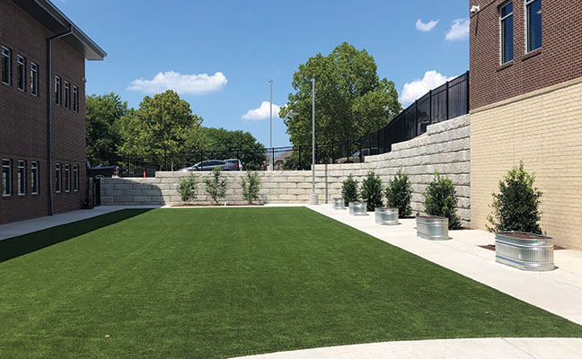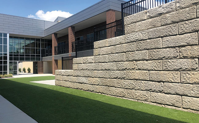 Located in Virginia Reinhardt Elementary School in Rockwell, Texas, this retaining wall project utilized precast concrete for a durable option to complete the recently renovated school. The goal of introducing the retaining walls was to create a better flow of pedestrian traffic. Superior Concrete Products engineered, manufactured, and installed five retaining walls varying in length and height from 130 feet long by 15 feet high, to 210 long feet by 16 feet high Northshore Granite Recon Retaining Wall. The retaining walls were designed as gravity walls, meaning the soil was excavated and cut on the existing site. The gravity walls are built with Recon blocks and can stand up to 45 feet high and 20 feet high without a geogrid.