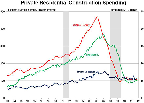 However, the recent improvement in new single-family construction spending is consistent with other indicators such as the gain in new single-family home sales and rising homebuilder sentiment. In addition, the upward trend in building permits for new single-family homes points to more gains in spending activity over the near term.