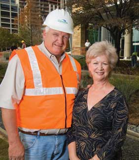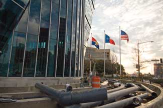 They just completed Hunt Corporate Headquarters in Dallas, Texas makes a huge change to the defining lines of downtown Dallas. The Project has three features Ð The elliptical pool at the front of the building has an infinity edge on the entire perimeter of the pool with a granite false floor making the water depth in this pool appear to be three inches deep.
