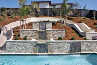 Once started, the project manager takes over. Each project manager has a crew with journeymen each of whom knows their part of the construction. Some do nothing but masonry, barbecues, walls, paving, or facades. Some only build decks, overhangs, screens and fences. Some do softscapes, irrigation installation, drainage, plantings, lighting, or water features. "Every aspect of the construction is completely under us," says Kobold. "We don't sub out anything but pool installs. But we do all the work around the pool-brick work, coping, tiles, and plantings." The firm also does a lot of formal and informal water features such as waterfalls that feed into pools, water that flows out of walls, and fountains that shoot up in the air.