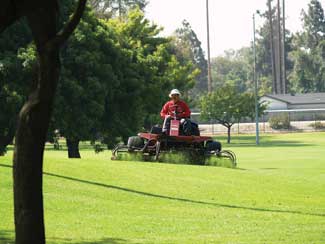 The golf course is adjacent to the ten million dollar sports center with four soccer fields and two baseball/softball fields. Park staff maintains the synthetic turf soccer fields, which is very specialized. It has to be groomed and brushed daily. ?EUR??,,????'??We have a grooming machine, looks like a lawn mower, but it is a specialized diesel tractor. Turf for the other fields is taken care of by Valley Crest. We had to buy two mowers because they couldn?EUR??,,????'???t mix the seeds of the two different types of grass on the other fields.