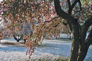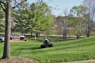 As a full service maintenance crew, we are responsible for all aspects of the landscape: mowing, edging, aerating and fertilizing the turf; edging, weeding and mulching the beds; planting, pruning and fertilizing the shrubs and trees; trash removal; leaf removal; snow removal and design of most beds and annual plantings. This work takes an average of two full time employees to keep the grounds safe and beautiful, but is shared by 12 employees ranging from gardeners, turf crew and an IMP specialist.