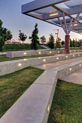 East Pavilion and West Pavilion The East Pavilion is the smaller performance venue with a canopy, seat walls and lawn areas that could accommodate up to 1,500 people. The East Pavilion has a small dry concession area comprised of sliding screens opening onto the shaded plaza and the Datum Walk. The concession area is envisioned for light catering, event information and ticketing, recreation program administration, small community arts and youth projects, plus other recreation and community uses. One wing of the East Pavilion offers accessible restrooms. The West Pavilion is a medium-sized performance venue with room for up to 2,000 people. It has a plaza for performances and sloped-lawn amphitheater with seatwalls. An accessible observation or balcony-level viewing area on the roof of the West Pavilion offers spectators additional gathering area. A storage/maintenance/staging area is located in the south end of the West Pavilion.