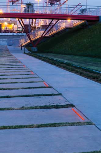 Along the port?EUR??,,????'???s industrial edge, the terrace walls are coated with titanium oxide, which transforms harmful air pollutants to inert organic compounds, a application of photocatalytic technology.