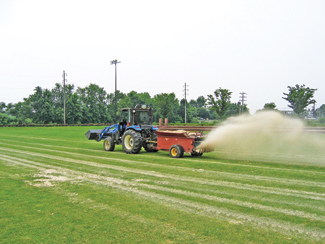 To complete topdressing, a Mill Creek PTO-powered spreader is hooked up to the same Ford Newholland tractor that pulled the aerator. Topdressing is an expensive and time-consuming task. Yeiser estimates that a 100,000-square-foot soccer field can take about 40 tons of sand?EUR??,,????'??+that?EUR??,,????'???s two dump truck loads.
