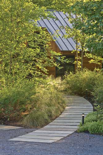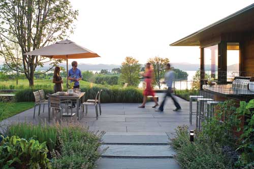 Design The team from Wagner Hodgson Landscape Architecture, led by Shelburne resident and principal Jeff Hodgson, partner Keith Wagner and project manager Doug Crowell, created a master plan for the compound after careful site investigation, including the adjacent parcel for a separate horse barn and pasture. Working closely with the architect, builder and client, the landscape architect sited the house to take full advantage of the views of the lake and mountains beyond. Orchestrating the flow of indoor rooms with the outdoor spaces, and creating a marriage between the house and the grade change offered by the promontory, blurred the distinctions between the disciplines integrate the new site elements. The outstanding views and the history of Shelburne Farms were a constant inspiration and focus for the entire design team. To accommodate the new house and outdoor areas, two mature sugar maples were moved over frozen ground during the first winter and placed prominently out in the meadow, framing the views towards the lake and mountains. The landscape architecture team worked closely with the architect to take advantage of the natural slope of the site, which resulted in two distinct house levels. The upper level contains the master suite and public spaces for entertaining, while the lower level contains guest rooms, a spa and pool. The project's architecture firm, Birdseye Design, is a Vermont design/build company that has many in-house craftsmen that work in metal, glass and wood. Collaboration between the builder, architect, landscape architect and interior designer was critical as the project moved forward.