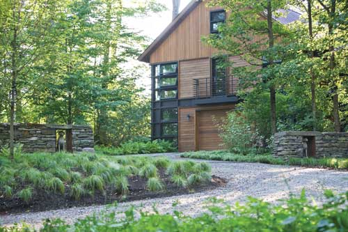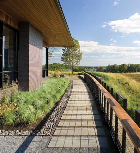 Rainwater falls from the residence's long horizontal roof into a Corten steel basin and runnel filled with pebbles from Lake Champlain, an architectural abstraction of the creeks surrounding the property. The runnel lies directly beneath the eaves of the house, and the water circulates north along the fa?????ade and bisects a stone wall. A lilac bluestone slab forms a bridge to the front entry from the arrival court and is illuminated by linear LED lighting underneath. Native fern planting provides a field for the runnel, and a series of Corten steel and stone weirs and falls guide the water as it turns west toward the lake. The falls create a meditative calm for the adjacent master and guest suites, and are visible from the bathrooms. The water ends in a Corten basin. A ledge stone entry bridge links the lower level terrace and a walking path to the woods. Photovoltaic panels installed on the horse barn significantly reduce the electricity required for the house, and power a pump that circulates the water and creates a wonderful amenity of sight and sound.
