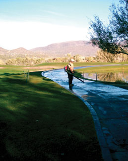 Bergstrom and his team are faced with a desert climate and the irrigation issues that come along with it, coupled with the fact that they do not have a real off-season to recoup and rebuild the course. Maintaining in the neighborhood of one hundred acres of total landscape is difficult in any climate, but when you take into account that Arizona receives only about seven inches of rainfall each year, the challenges that Rancho Ma?????ana faces can be daunting.