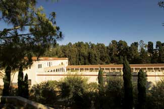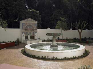 Unlike its Italian model, the California villa does not overlook the sea but resides in a canyon surrounded by streets, homes and eucalyptus trees. The setting is a departure from accuracy, but does have the advantage of protecting the gardens from traffic noise and the northwest winds that blow off the Pacific during the summer months. The sheltered spot also has the advantage of a favorable microclimate for roses and other plants that find coastal mist stressful.
