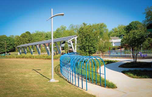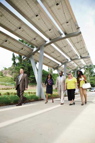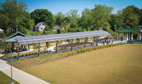 The solar canopy is a 120-foot long structure topped with a 22-killowatt array of Suniva photovoltaic panels. The solar array generates enough electricity to power 10 homes. The power produced is sold to Georgia Power for about 18 cents per kilowatt. When the park needs electrical power for the lights and other energy needs, it can purchase energy off Georgia Power's grid for only 8.5 cents per kilowatt. The panels also create shade on the park's central promenade. Taking the energy savings a step further, the entire park is lit with LEDs that greatly reduce electrical energy and cuts the park's lighting bill in half.