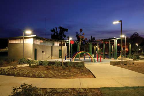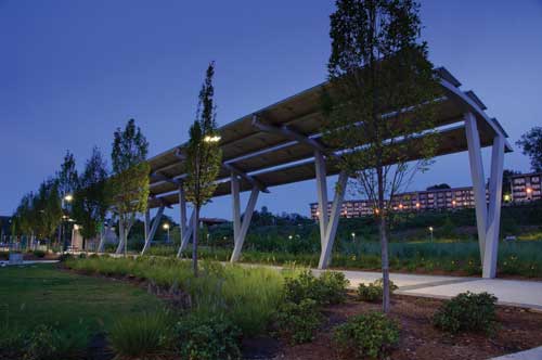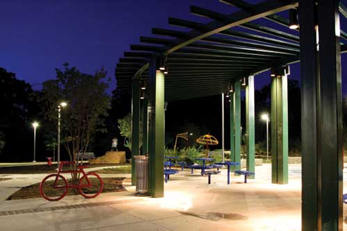 The park's central promenade is illuminated by 47 "Leonis' LEDs (Philips Lumec). The LEDs use about 20-30 percent less energy than conventional HID fixtures, according to the manufacturer. Photo: Matthew Wilder
