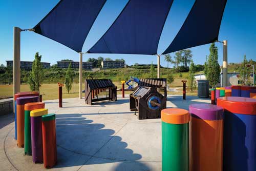 The Stanton Park program included a new playground, greatly expanded from the old one to include traditional swings, climbers, slides, bouncers, and spinners, but also adding musical instruments and a tactile landscape in which children can climb on boulders, roll down a grassy hill and play among the different textures of the planted landscape.