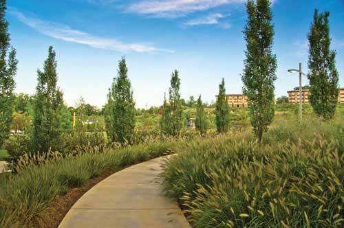 The park design needed to be environmentally conscious and sustainable. The vision for Stanton Park was guided by meeting the recreation, social and community health needs. The city needed a park that would endure and be economical to maintain. Pond and Company landscape architect's philosophy and approach is always to design and plan for the finished project to function at the highest achievable level of self-sufficiency, with a goal of long-term sustainability. To be truly sustainable the park had to reduce demand and impact on natural resources.