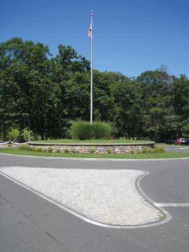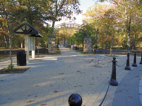 Project Design Phase 1: Phase one was devoted to restoring vehicle and pedestrian circulation: enhancing the park entrance; reconstruction of the park drive and parking; upgrades to the storm drainage (including water quality features) and related utility infrastructure; creating new sidewalks to reduce pedestrian and vehicle conflicts; and developing way finding. A new roundabout with ornamental stonewalls, flag pole and landscaping became the centerpiece. Period lighting was reintroduced to the park, and decaying shade trees replaced. The new entry involved restoration of the war memorial and introduction of stone gateway pillars.