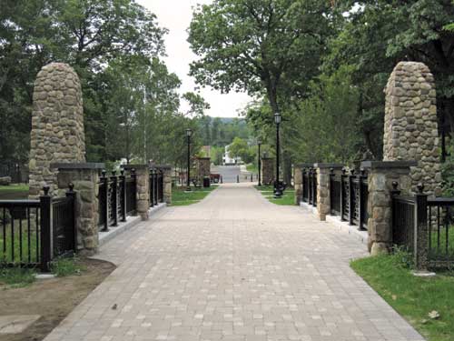 The bridge over the Pequabuck River and the large stone obelisks were reconstructed. A new pedestrian promenade was designed to link the main park to the lagoon area. The tree-lined promenade has unit pavers, with period-style lighting and site furnishings. A new curved stonewall retains the western end of the open body of water. Four of the historic stone buildings on the National Registry were reconstructed and/or restored. One of the hallmark features of all the original buildings, walls and structures in the park is the river cobble fa?????ades for the new walls and related structures, all the cobbles excavated on site.