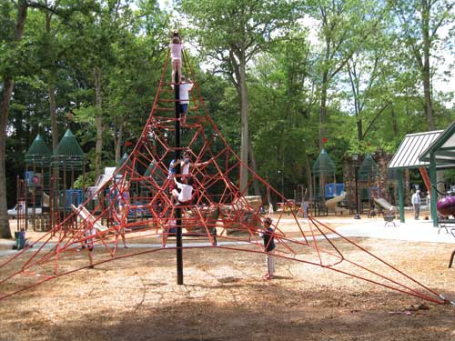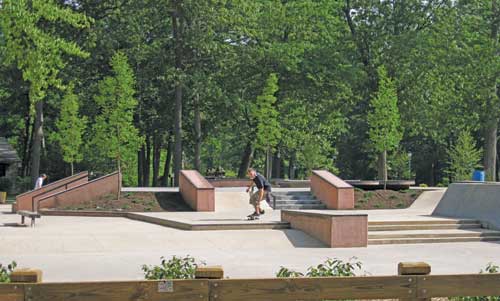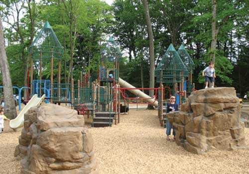 Vendors Benches: Dumor Site Furnishings Bike Racks: P.W. Athletic Mfg. Co., Mesa, Ariz. Colorized Concrete Sidewalks and Skatepark Admixture Color: L. M. Scofield Co., Rutherford, New Jersey Play Structures: Colombia Cascade Co. GameTime: Lil Wum Climber and Saddlemates (little cars, duck) Landscape Structures Inc.: Rock Climbers and Spacenet Fencing at Spraypark: Colombia Cascade Co. Lighting: Spring City Electrical Manufacturing Co., Spring City, Penn. Hubbell Lighting, Inc. (athletic fields), Greenville, S.C. Pavilions: Classic Recreation Spray Park: Fountain People Inc., Water Odyssey Trash Receptacle: Dumor Site Furnishings