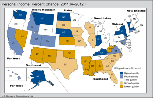 Personal income rose in 47 out of 50 states in the first quarter of 2012, according to a Commerce Department report released June 27, to the tune of 0.8 percent, a marked increase over the 0.5 percent growth in the last quarter of 2011. The three outliers were Mississippi and Kansas, which declined 0.3 and 0.1 percent respectively, and Oklahoma, where the figure was unchanged.
