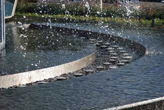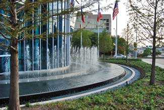 The custom fountain wraps the entire front face of the building and introduces into the main entry vestibule, blurring the line between interior and exterior, landscape and architecture, organic and built. The dynamic of an elliptical fountain within an elliptical building structure is a remarkable phenomenon. This fountain, an elliptical pool with stainless-steel basin, trough and weir strips, is capable of producing vivacious LED-choreographed light shows, which can be choreographed with the building?EUR??,,????'?????<???EUR?s own dynamic light show capabilities; this is yet another facet of the composition?EUR??,,????'?????<???EUR?s integration between elements.