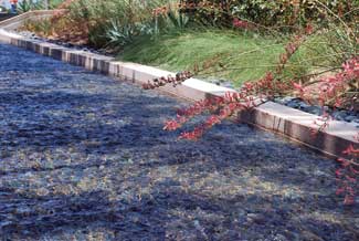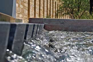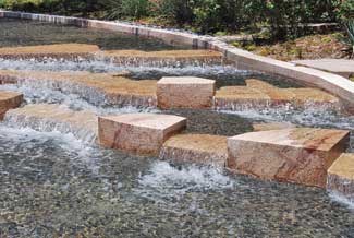 Segmental slabs of stone were placed in an architectural abstract of an organic ?EUR??,,????'?????<?lift?EUR??,,????'?????<? and arranged to an incline at the point where two runnels merged, while additional pieces protrude into the landscape. The various stones were placed in a varying vertical alignments to create a contoured weir edge; black Mexican cobbles and amber-colored granite are just a few of the distinguished accents incorporated into this creation.