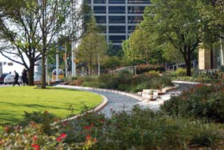On the side opposite the centerpiece fountain, the west-facing elevation, there exists a large green expanse that was envisioned as the building?EUR??,,????'?????<???EUR?s front yard?EUR??,,????'?????<??oeall that is missing is the token white picket fence. This space is a ceremonial front entry that is aesthetically striking but also low-maintenance and durable. All plant material is either native or adaptive. The vegetation can handle the occasional ice storm as well as 100-degree summer days.