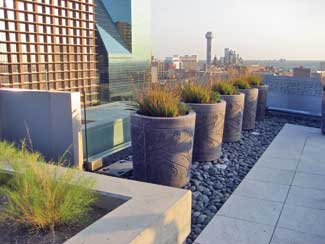 Much like the garden on the south side from which the architectural stream originates, the eighth-floor terrace garden is comprised of a carefully chosen, drought-tolerant palette that can handle a range of climatic conditions. Both gardens feature nontraditional Dallas materials such as red and twistleaf yuccas, gulf muhly, purple lantanas, bulbines and knockout roses, an adaptive species that provides brilliant year-round color. Like the rest of the vegetation, these plants are watered with exceptionally efficient drip irrigation, which required detailed coordination between architects and contractors. Much like everything else at Hunt, the rooftop garden is of a highly integrated continuity. For example, the building?EUR??,,????'?????<???EUR?s parapet features custom-designed metalwork; this custom design was then incorporated into the terrace?EUR??,,????'?????<???EUR?s cast-stone planters.