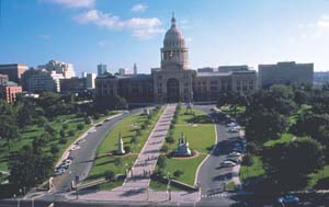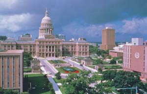Everything is bigger in Texas! Case in point; the Texas State Capitol building located in Austin. Standing at the head of Congress Avenue, the building stands 302.64 feet high, almost 300 feet wide and stretches just over 585 feet long. The enormous building is the largest of all state capitol buildings and is second in total size only to the National Capitol in Washington. The building itself is dwarfed by the landscape, which amounts to nearly 14 acres of turf, flower beds, trees and sidewalks.