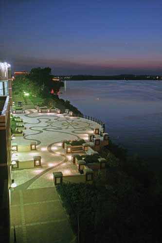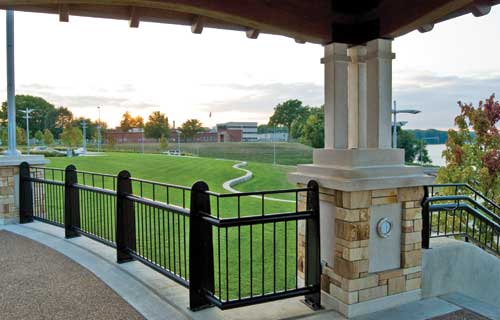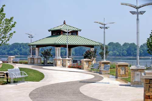 Concrete banding of river stone in the walkway gives the illusion of movement while stainless steel light fixtures create dramatic indoor illumination effects outdoors. Combined with the use of regional materials such as limestone and sandstone, a bosque of trees and local labor, the Mitch McConnell Riverwalk and Plaza adds a contemporary elegance to the city of Owensboro.