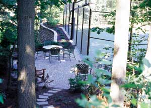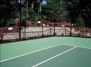 ?EUR??,,????'??Along the southeastern side of the court, a 25x15 foot irregular shaped patio was placed abutting the court and fencing. This patio, which includes the barbecue area, tables and chairs, provides excellent viewing of the court?EUR??,,????'???s playing area,?EUR??,,????'?? Medeiros said. ?EUR??,,????'??Granette Setts, a seven-stone paver system, also in the fieldstone color, were selected for their ability to deliver a natural path-like look as well as to integrate the patio setting into the overall design.?EUR??,,????'??